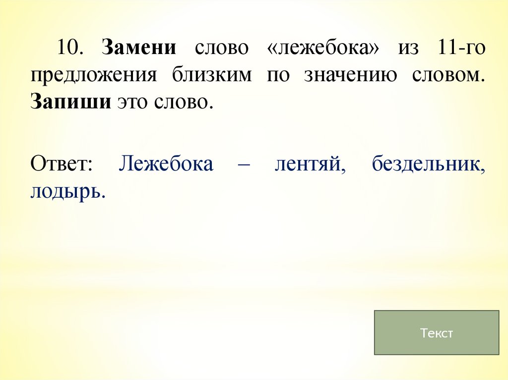 10. Замени слово «лежебока» из 11-гопредложения близким по значению словом.
