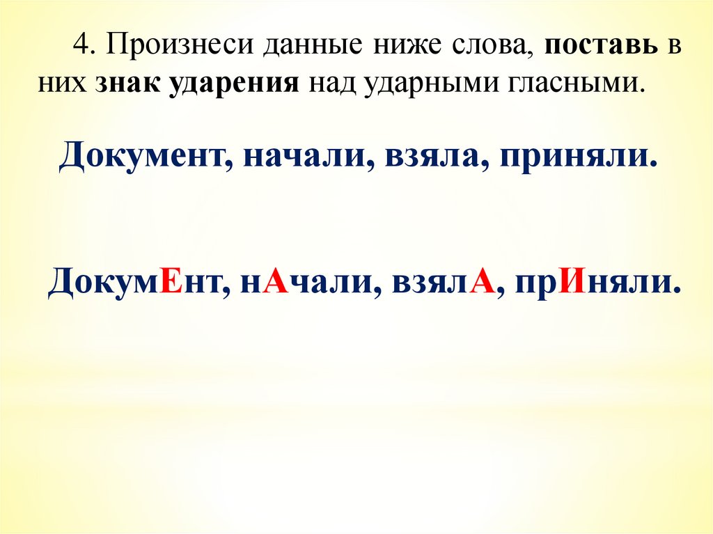4. Произнеси данные ниже слова, поставь вних знак ударения над ударными гласными.