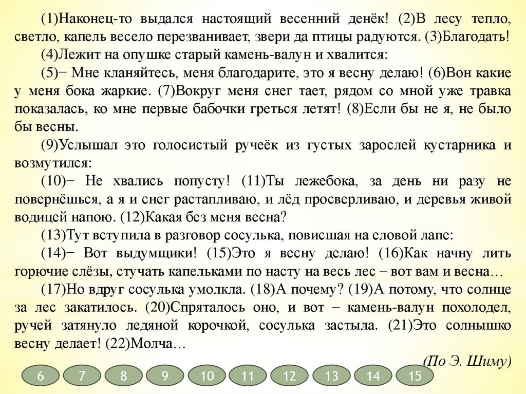(14)− Вот выдумщики! (15)Это я весну делаю! (16)Как начну лить
