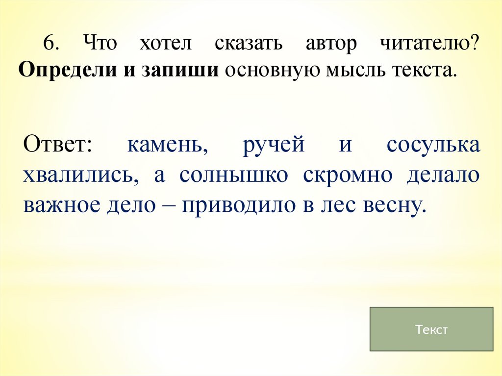 6. Что хотел сказать автор читателю?Определи и запиши основную мысль текста.