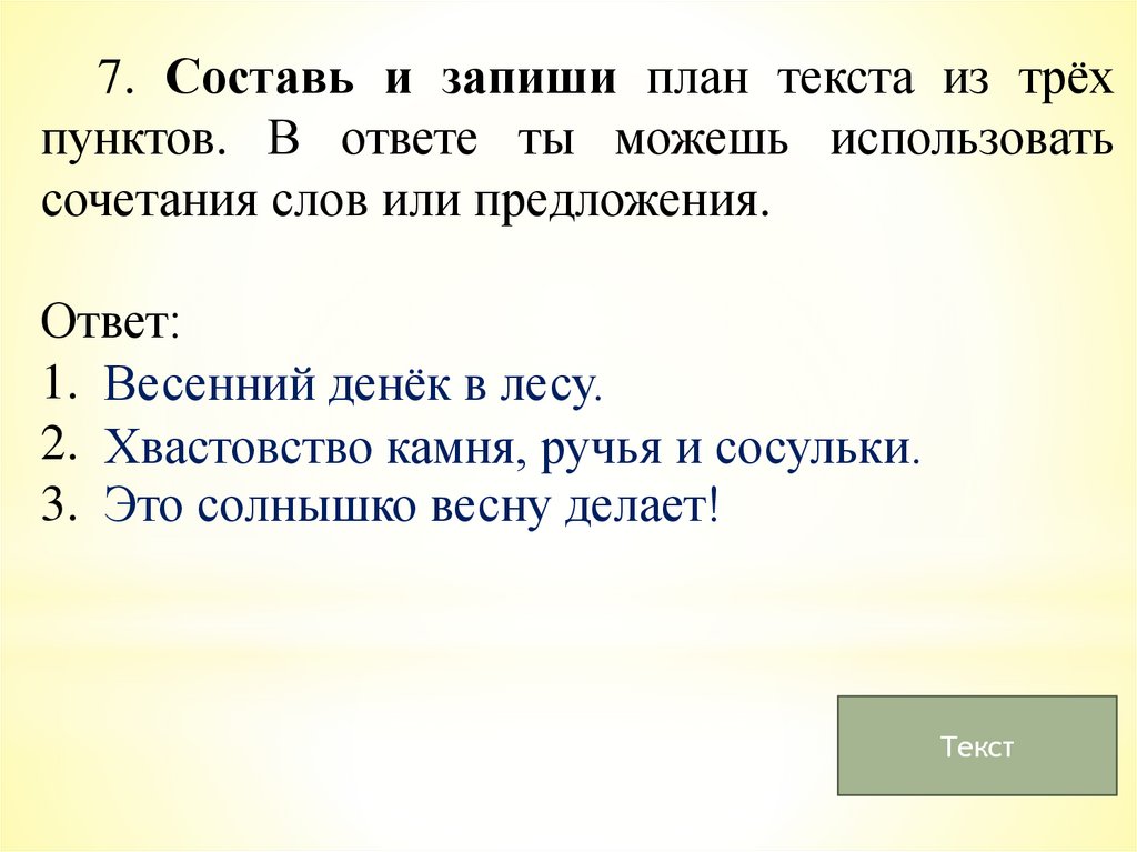 7. Составь и запиши план текста из трёхпунктов. В ответе ты можешь использовать