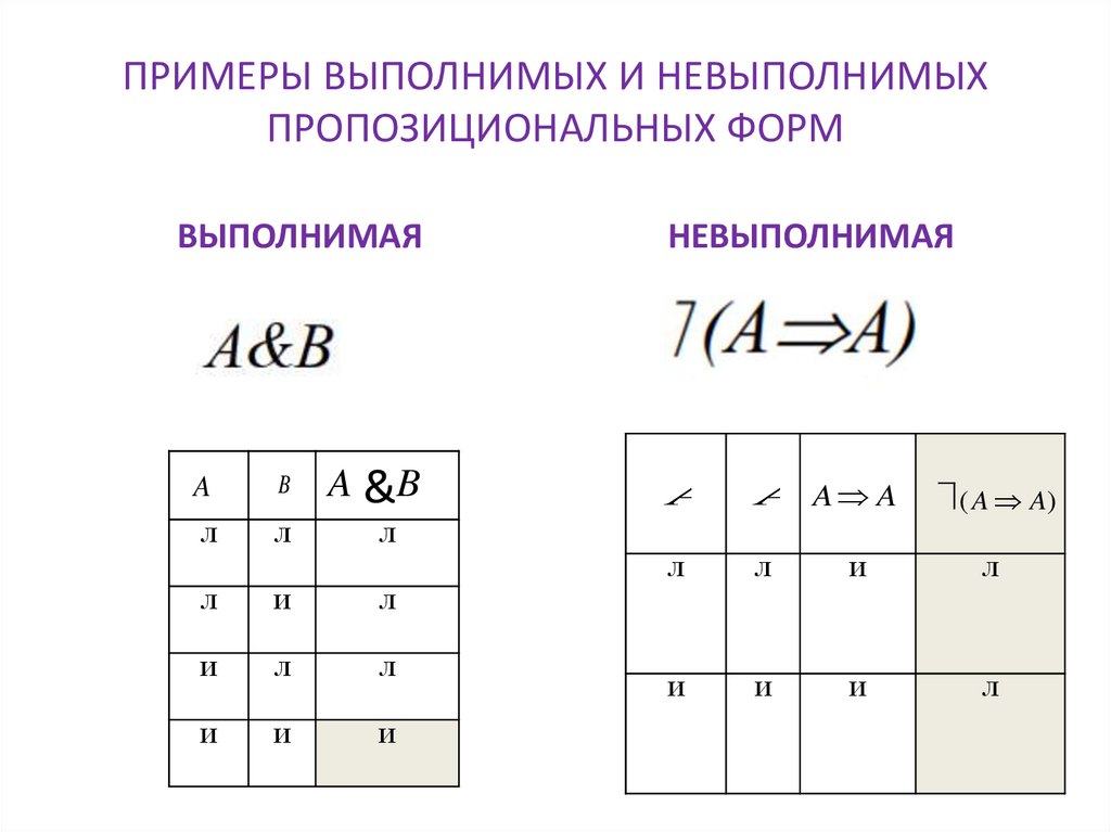 ПРИМЕРЫ ВЫПОЛНИМЫХ И НЕВЫПОЛНИМЫХПРОПОЗИЦИОНАЛЬНЫХ ФОРМ