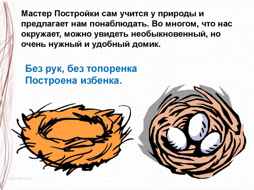 Мастер Постройки сам учится у природы ипредлагает нам понаблюдать. Во многом, что нас