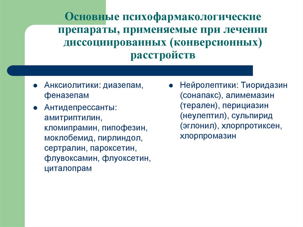 26. Основные психофармакологические препараты, применяемые при лечении диссоциированных (конверсионных) расстройств