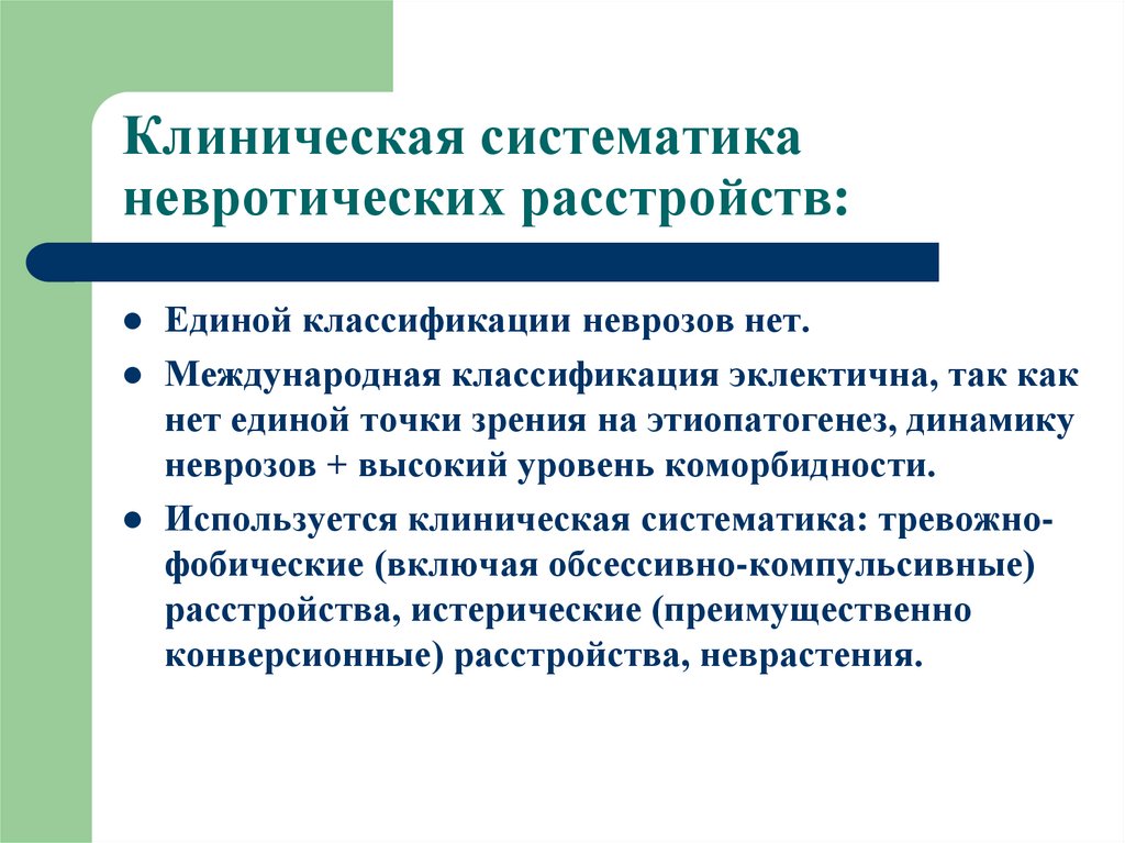 Единой классификации неврозов нет.Международная классификация эклектична, так как