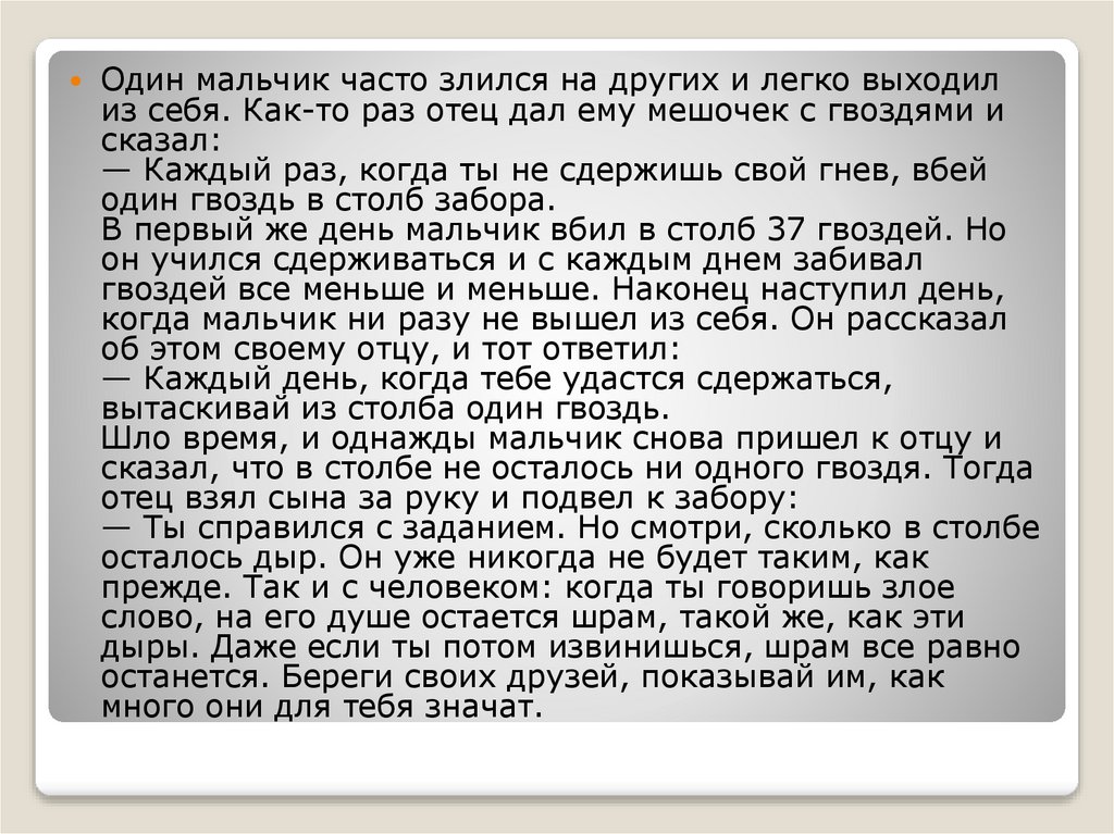 Один мальчик часто злился на других и легко выходилиз себя. Как-то раз отец дал ему мешочек с гвоздями и