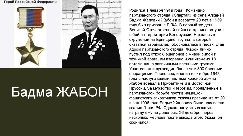 Бадма ЖАБОНРодился 1 января 1919 года. Командир