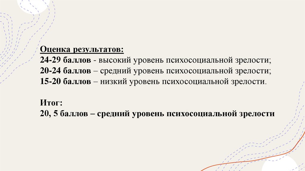 Оценка результатов:24-29 баллов - высокий уровень психосоциальной зрелости;