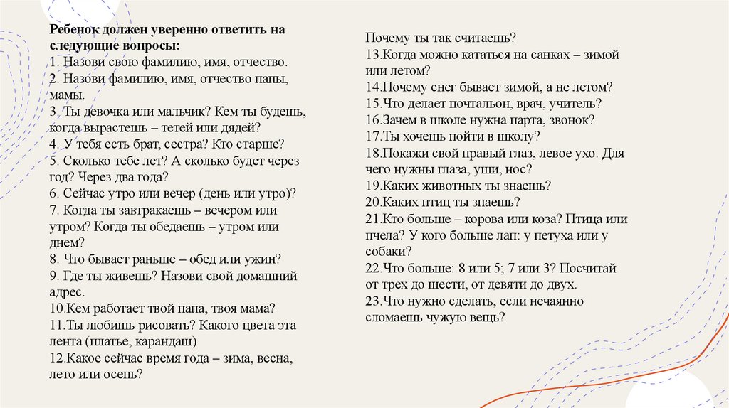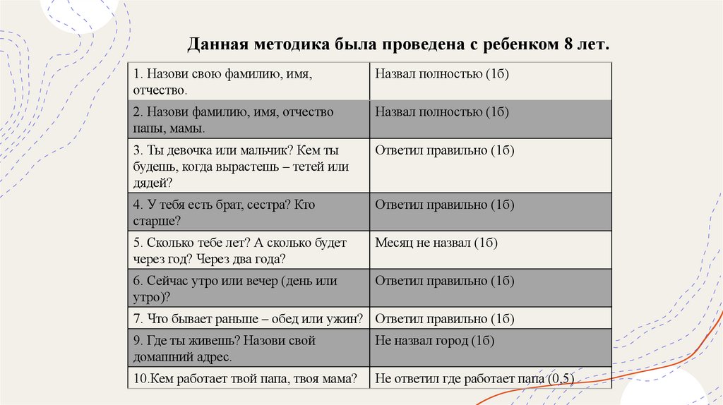 Данная методика была проведена с ребенком 8 лет.1. Назови свою фамилию, имя,