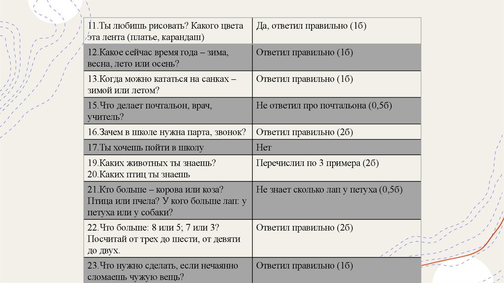 № 5 – ребенок может вычислить, сколько ему лет - 1 балл, называет год с учетом месяцев – 3