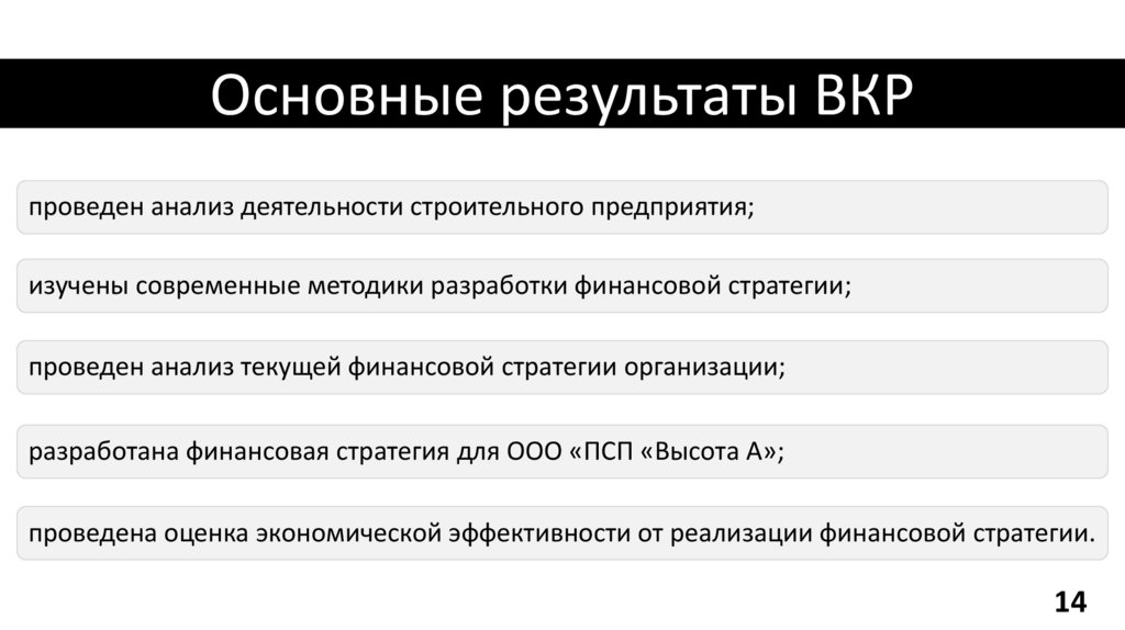 Основные результаты ВКРпроведен анализ деятельности строительного предприятия;