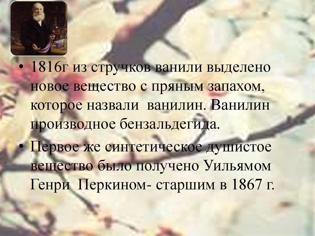 • 1816г из стручков ванили выделеноновое вещество с пряным запахом,