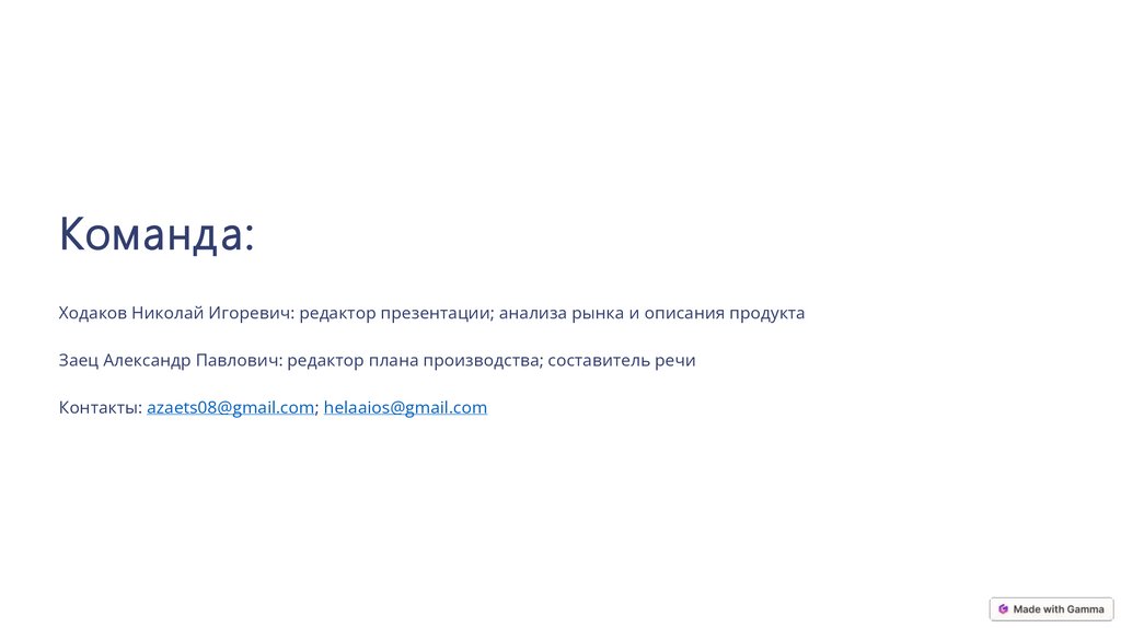 Команда:Ходаков Николай Игоревич: редактор презентации; анализа рынка и описания продукта