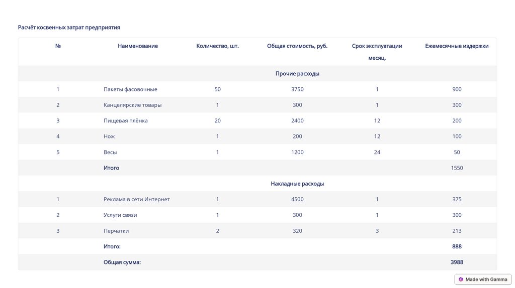 Расчёт косвенных затрат предприятия№