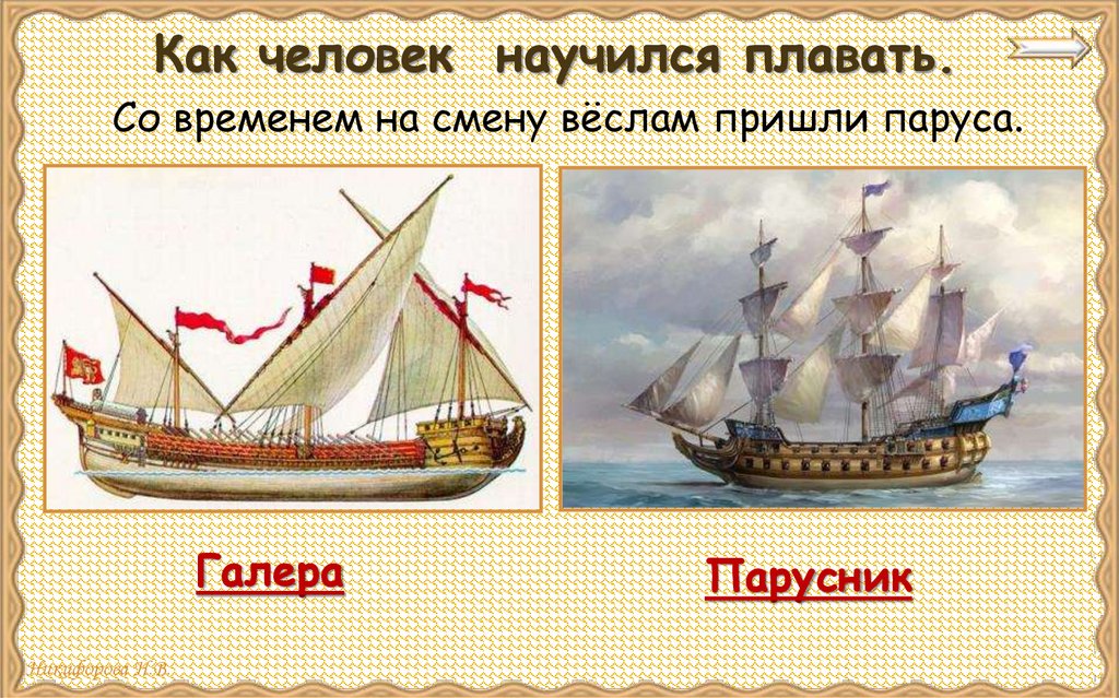 Как человек научился плавать.Со временем на смену вёслам пришли паруса.
