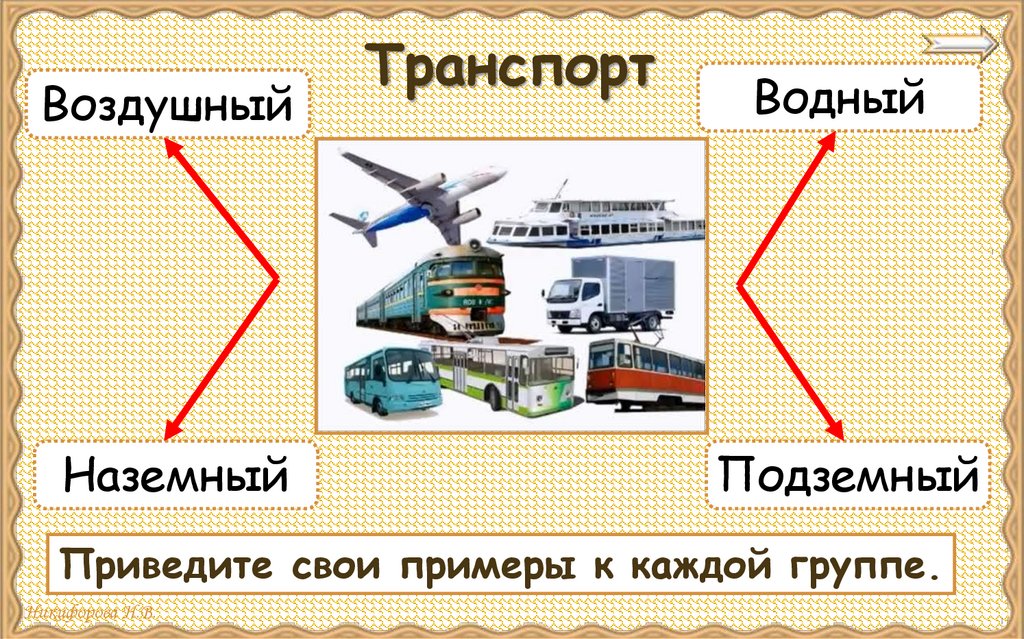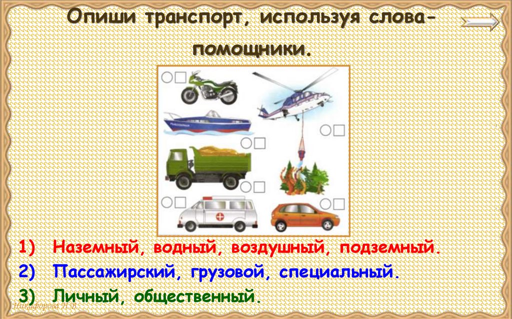 Опиши транспорт, используя словапомощники.1) Наземный, водный, воздушный, подземный.