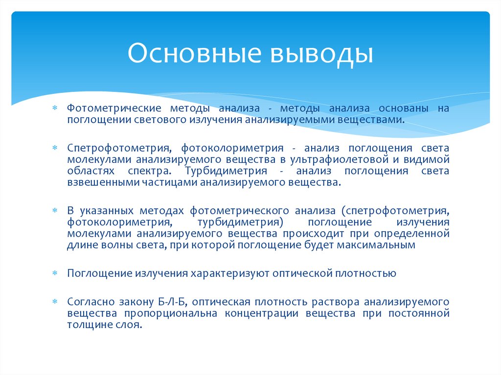 Основные выводыФотометрические методы анализа - методы анализа основаны на