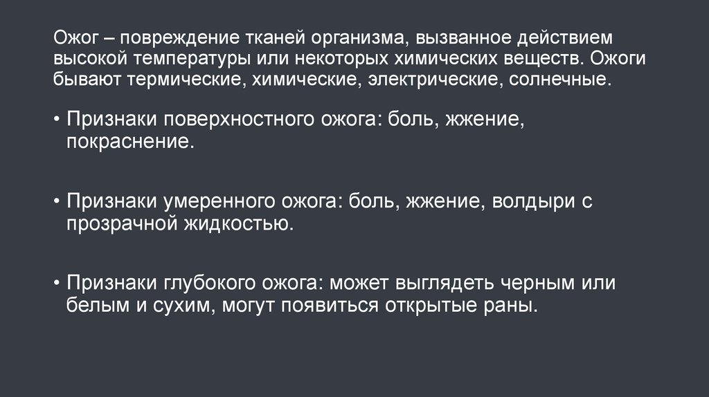Ожог – повреждение тканей организма, вызванное действиемвысокой температуры или некоторых химических веществ. Ожоги