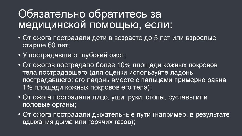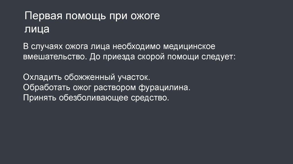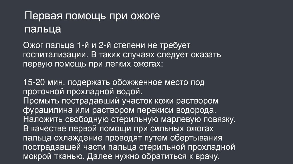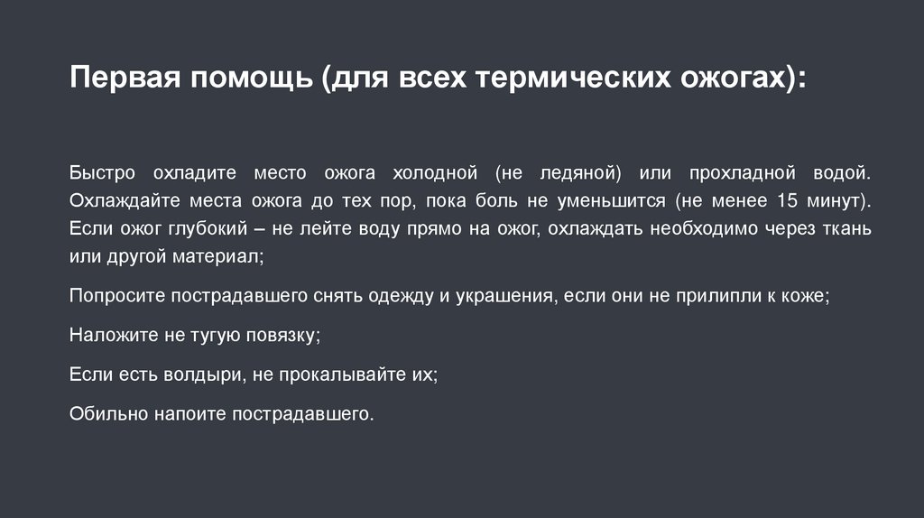 Первая помощь (для всех термических ожогах):Быстро охладите место ожога холодной (не ледяной) или прохладной водой.