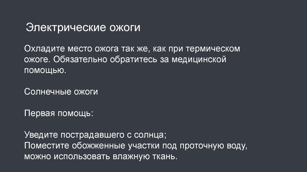 Электрические ожогиОхладите место ожога так же, как при термическом