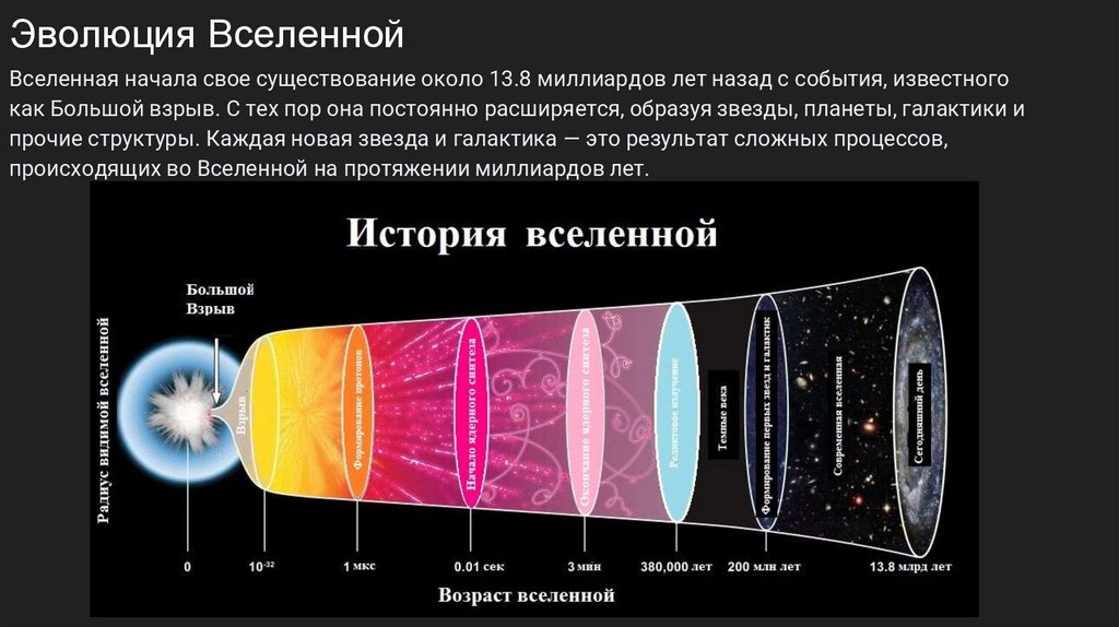 Эволюция ВселеннойВселенная начала свое существование около 13.8 миллиардов лет назад с события, известного