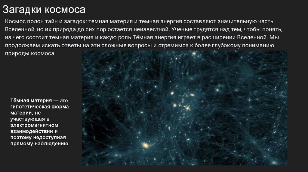 Загадки космосаКосмос полон тайн и загадок: темная материя и темная энергия составляют значительную часть