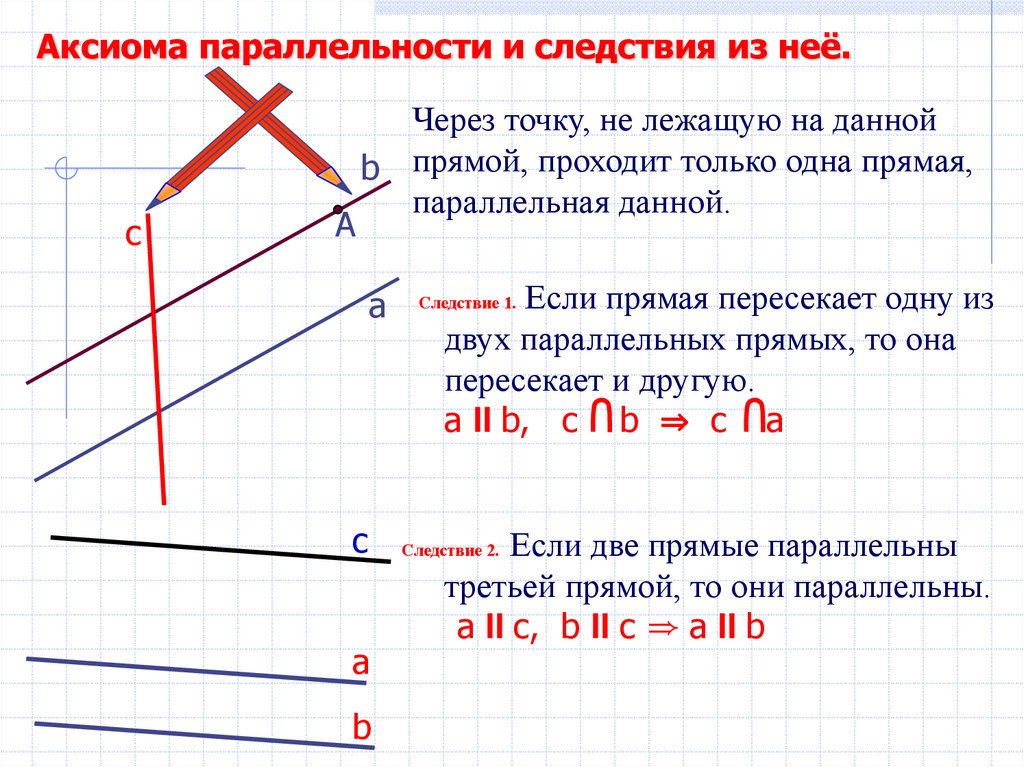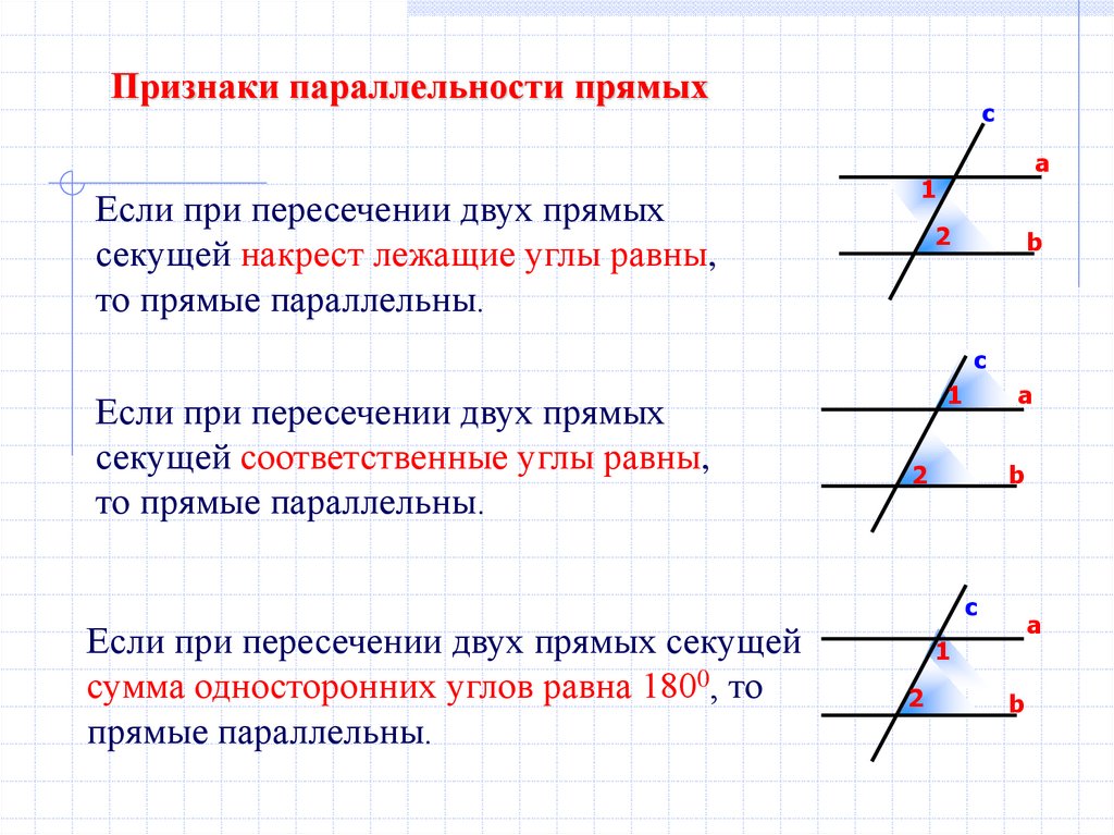 Признаки параллельности прямыхЕсли при пересечении двух прямых