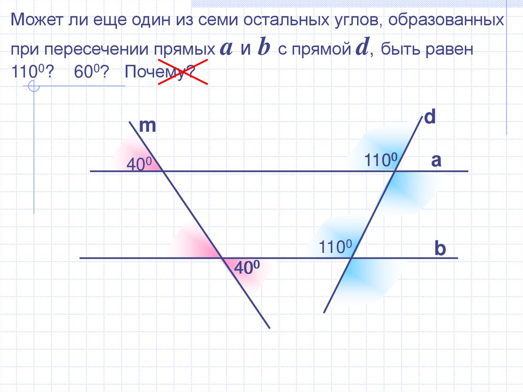 Может ли еще один из семи остальных углов, образованныхпри пересечении прямых a и b с прямой d, быть равен