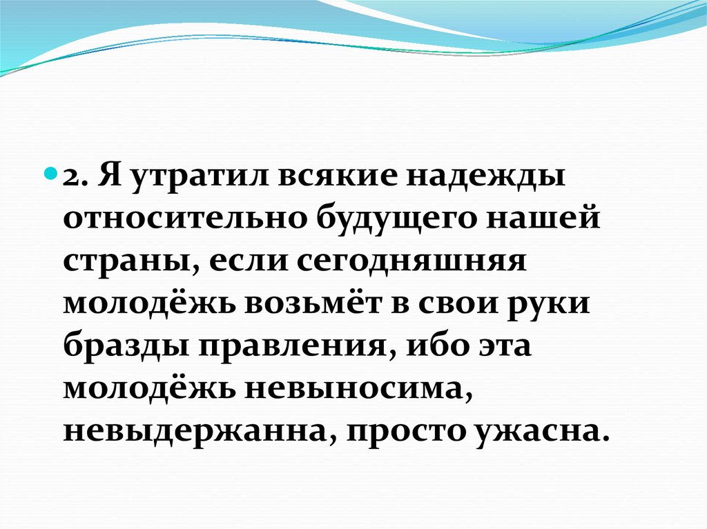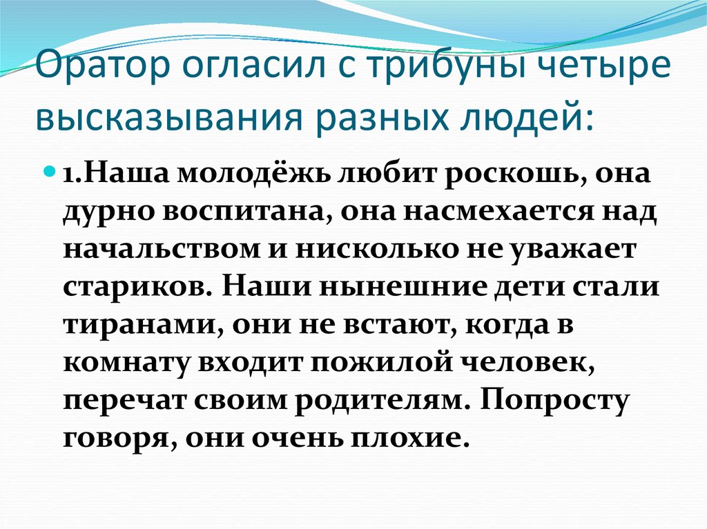 1.Наша молодёжь любит роскошь, онадурно воспитана, она насмехается над