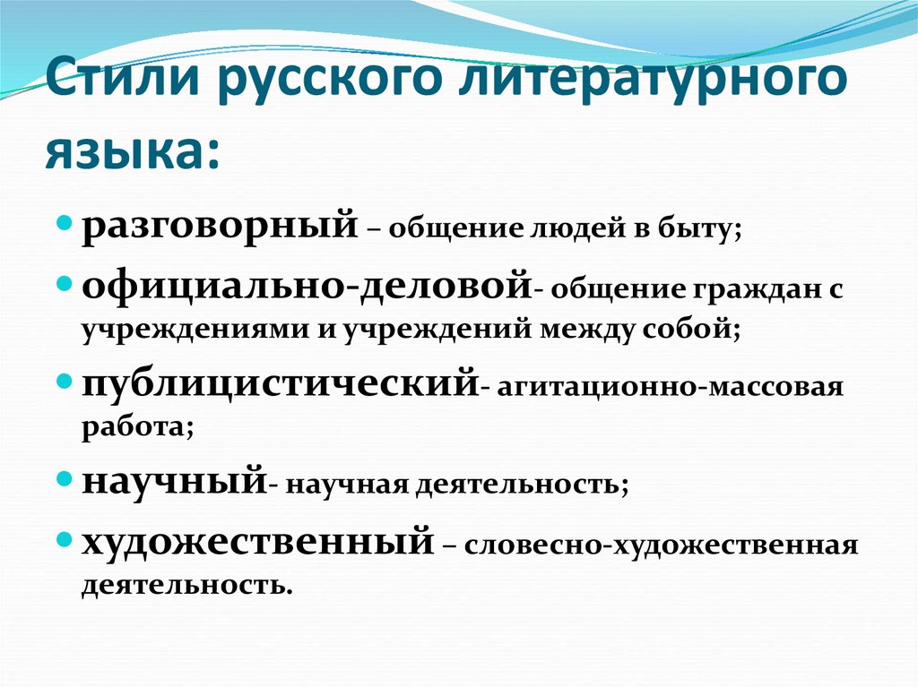 разговорный – общение людей в быту;официально-деловой- общение граждан с