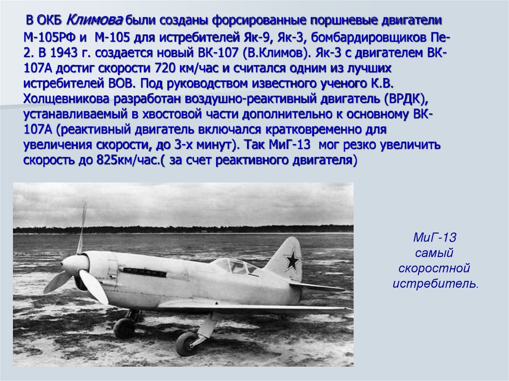 В ОКБ Климова были созданы форсированные поршневые двигателиМ-105РФ и М-105 для истребителей Як-9, Як-3, бомбардировщиков Пе2. В 1943 г. создается новый ВК-107 (В.Климов). Як-3 с двигателем ВК107А достиг скорости 720 км/час и считался одним из лучших