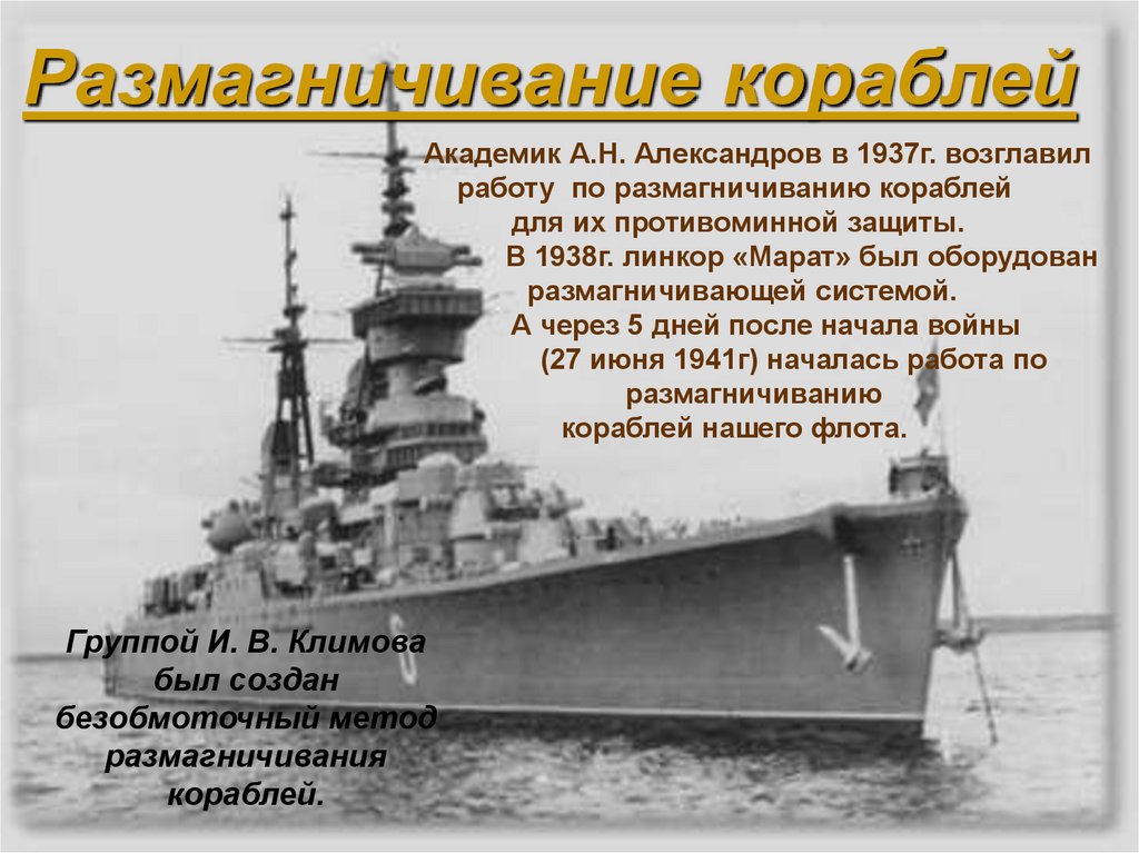 Размагничивание кораблейАкадемик А.Н. Александров в 1937г. возглавил