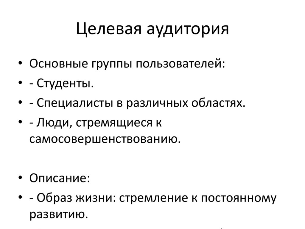 Целевая аудитория• Основные группы пользователей: