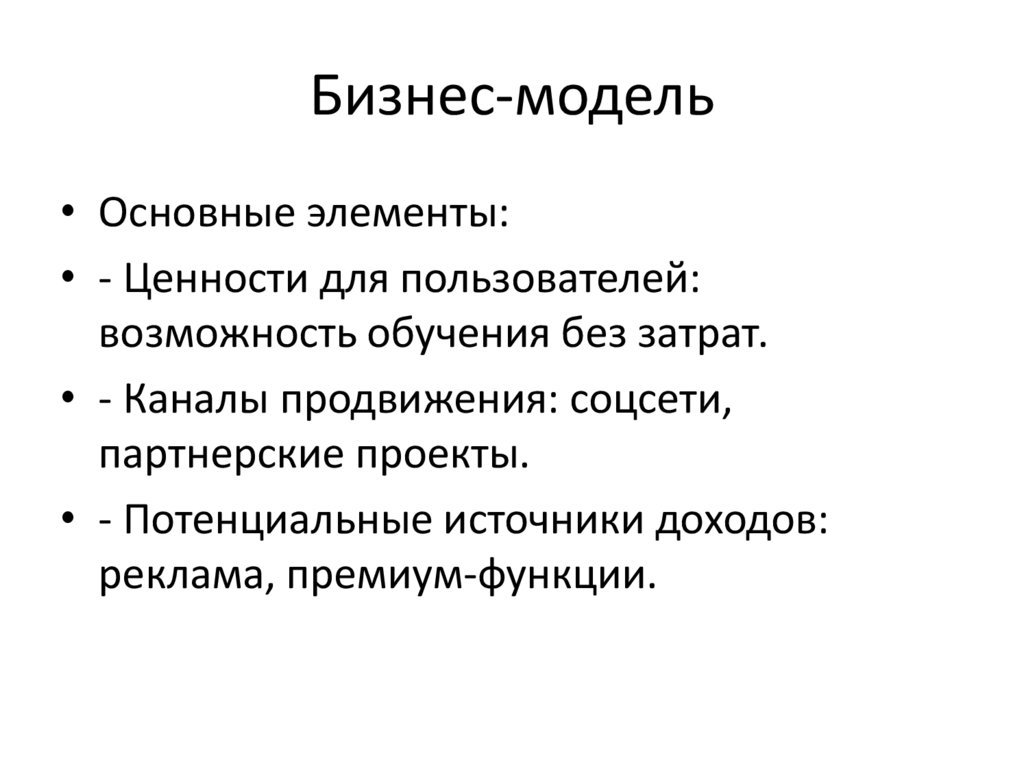 Бизнес-модель• Основные элементы: