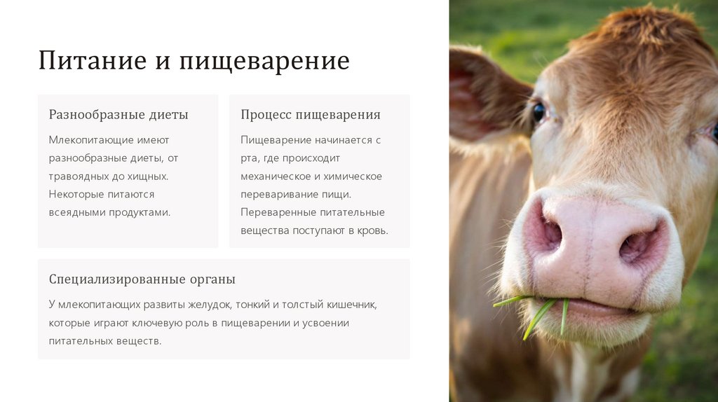 Млекопитающие адаптируются к различным источникам пищи. Например, травоядные животные имеют