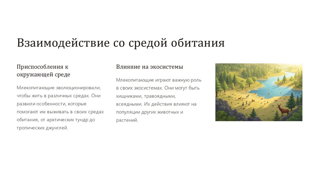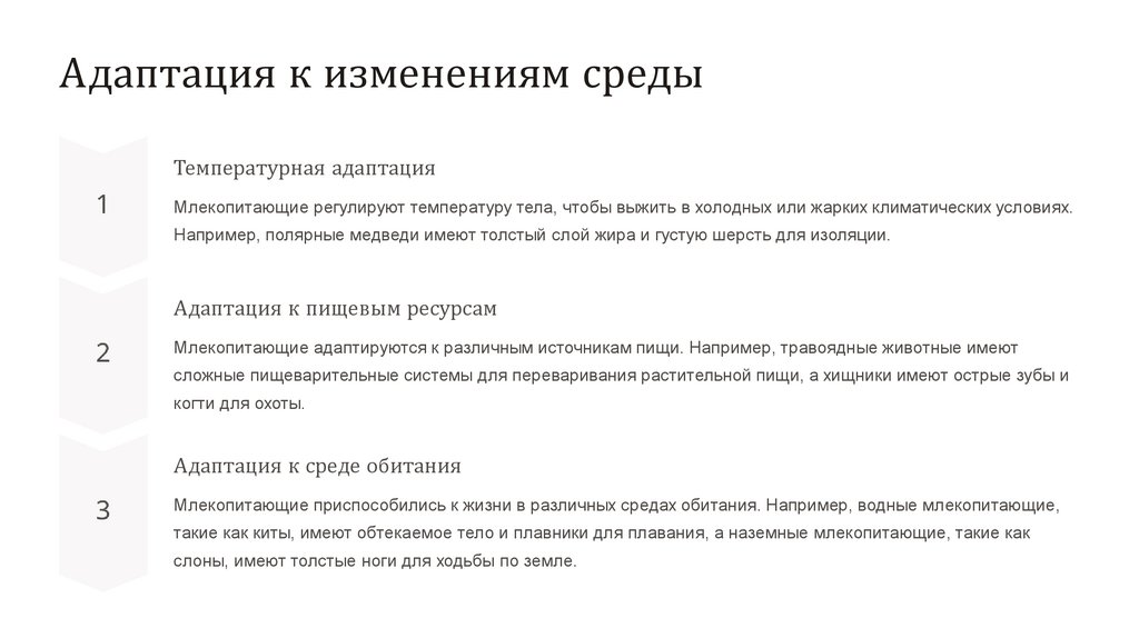 Млекопитающие приспособились к жизни в различных средах обитания. Например, водные млекопитающие,