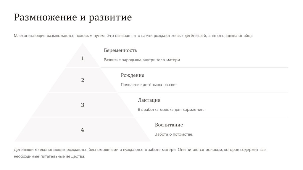 Размножение и развитиеМлекопитающие размножаются половым путём. Это означает, что самки рождают живых детёнышей, а не откладывают яйца.