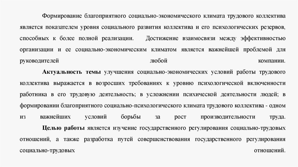 Формирование благоприятного социально-экономического климата трудового коллективаявляется показателем уровня социального развития коллектива и его психологических резервов,