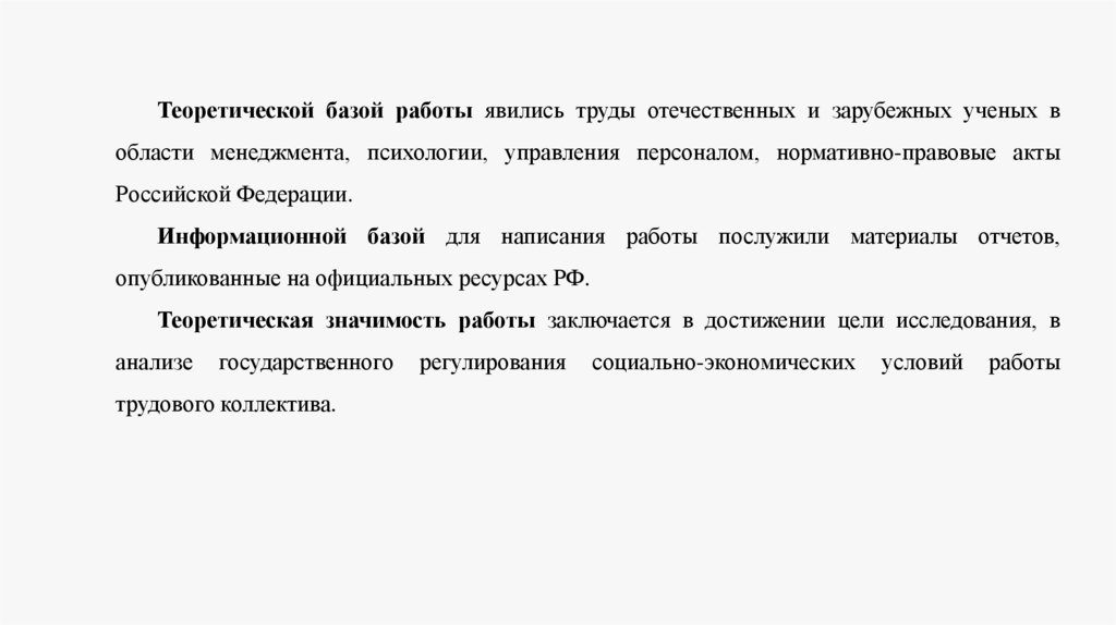 Теоретической базой работы явились труды отечественных и зарубежных ученых вобласти менеджмента, психологии, управления персоналом, нормативно-правовые акты