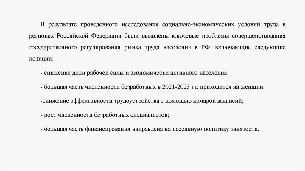 В результате проведенного исследования социально-экономических условий труда врегионах Российской Федерации были выявлены ключевые проблемы совершенствования