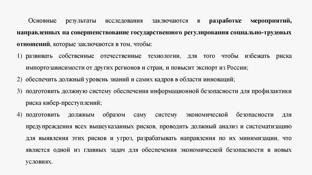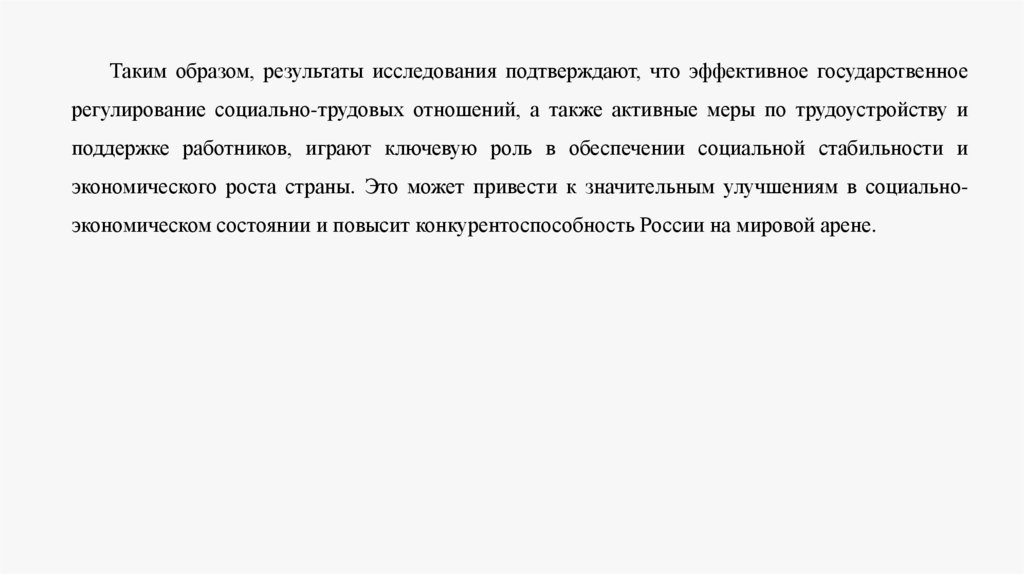 Таким образом, результаты исследования подтверждают, что эффективное государственноерегулирование социально-трудовых отношений, а также активные меры по трудоустройству и