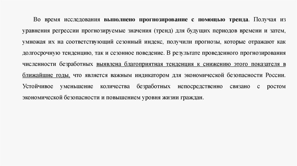 Во время исследования выполнено прогнозирование с помощью тренда. Получая изуравнения регрессии прогнозируемые значения (тренд) для будущих периодов времени и затем,