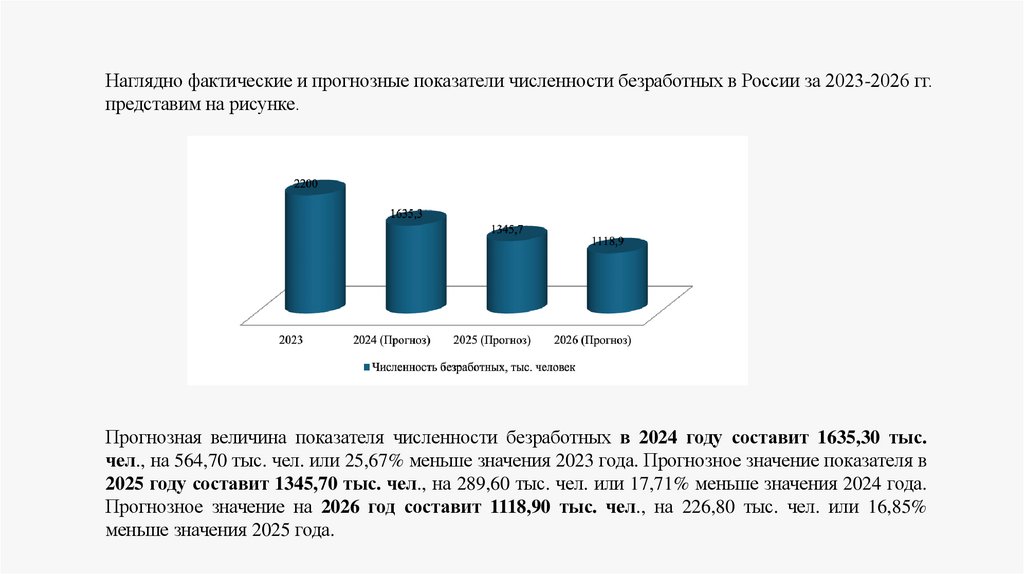 Наглядно фактические и прогнозные показатели численности безработных в России за 2023-2026 гг.представим на рисунке.