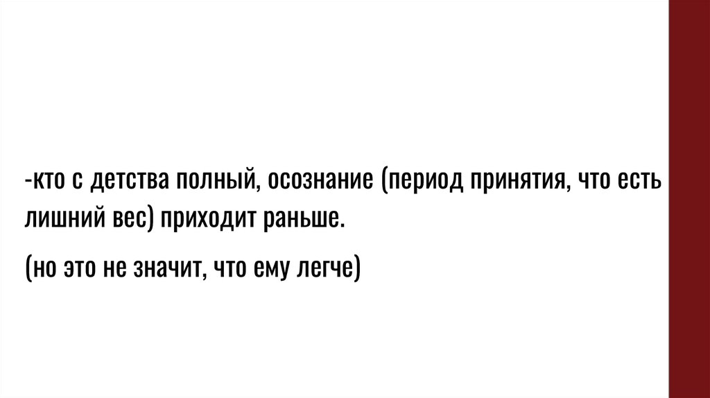 -кто с детства полный, осознание (период принятия, что естьлишний вес) приходит раньше.