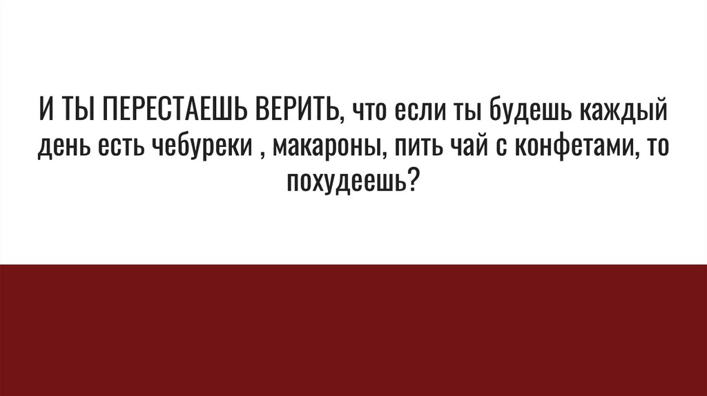 И ТЫ ПЕРЕСТАЕШЬ ВЕРИТЬ, что если ты будешь каждыйдень есть чебуреки , макароны, пить чай с конфетами, то