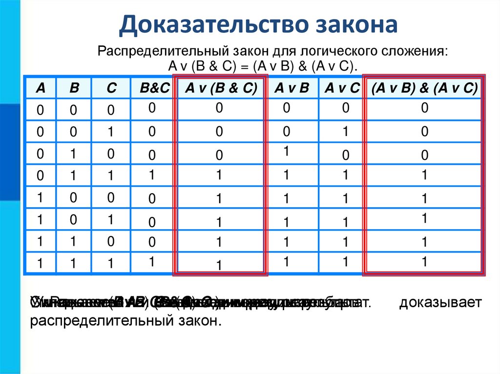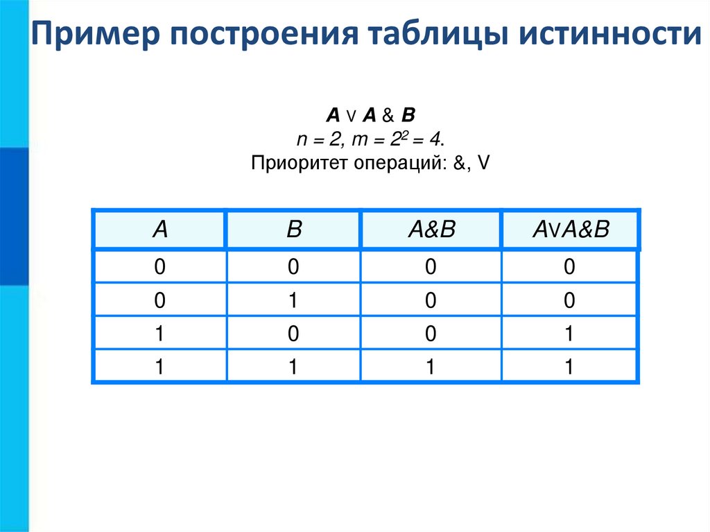 Приоритет выполнения логических операций: ¬, &, V.