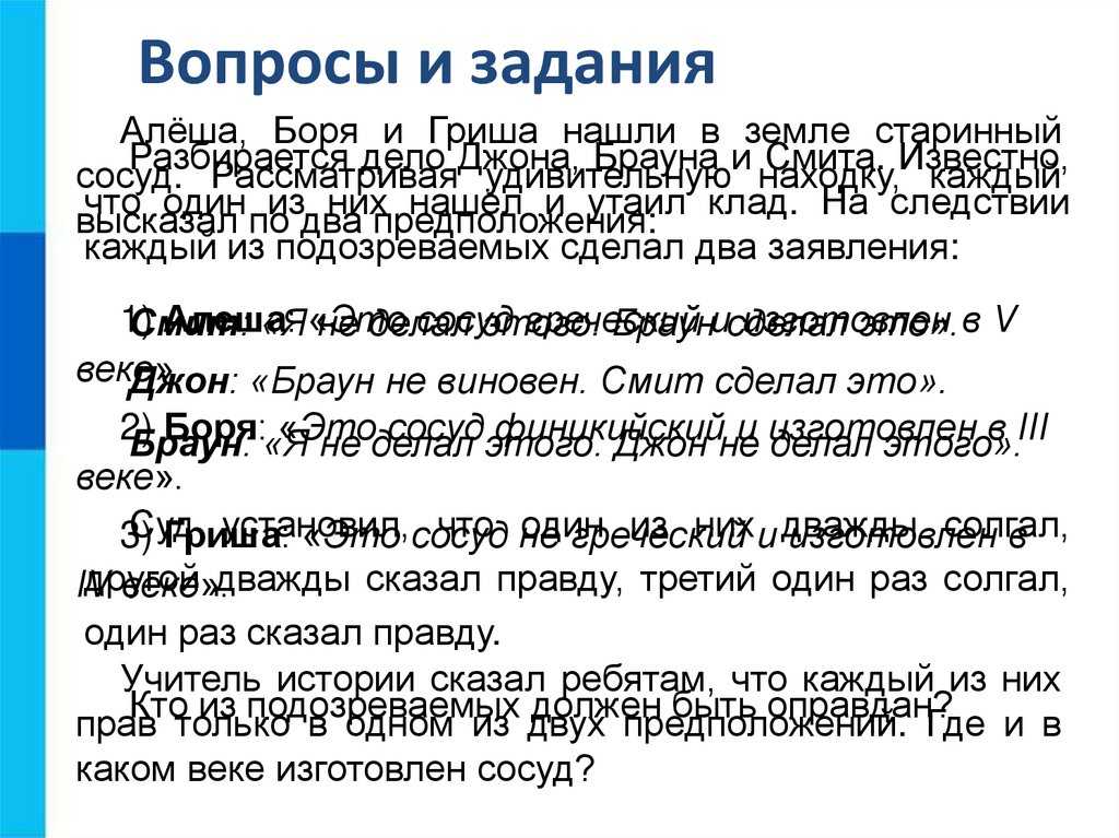 Вопросы и заданияАлёша, Боря и Гриша нашли в земле старинный