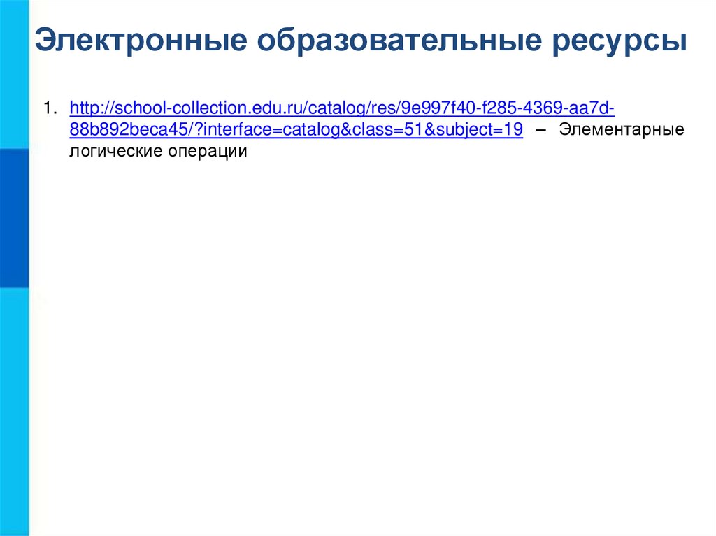 Электронные образовательные ресурсы1. http://school-collection.edu.ru/catalog/res/9e997f40-f285-4369-aa7d88b892beca45/?interface=catalog&class=51&subject=19 – Элементарные