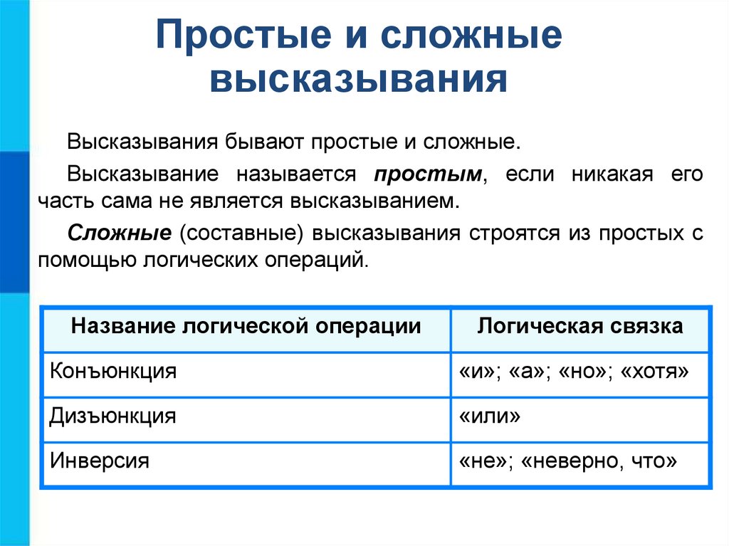 Высказывания бывают простые и сложные.