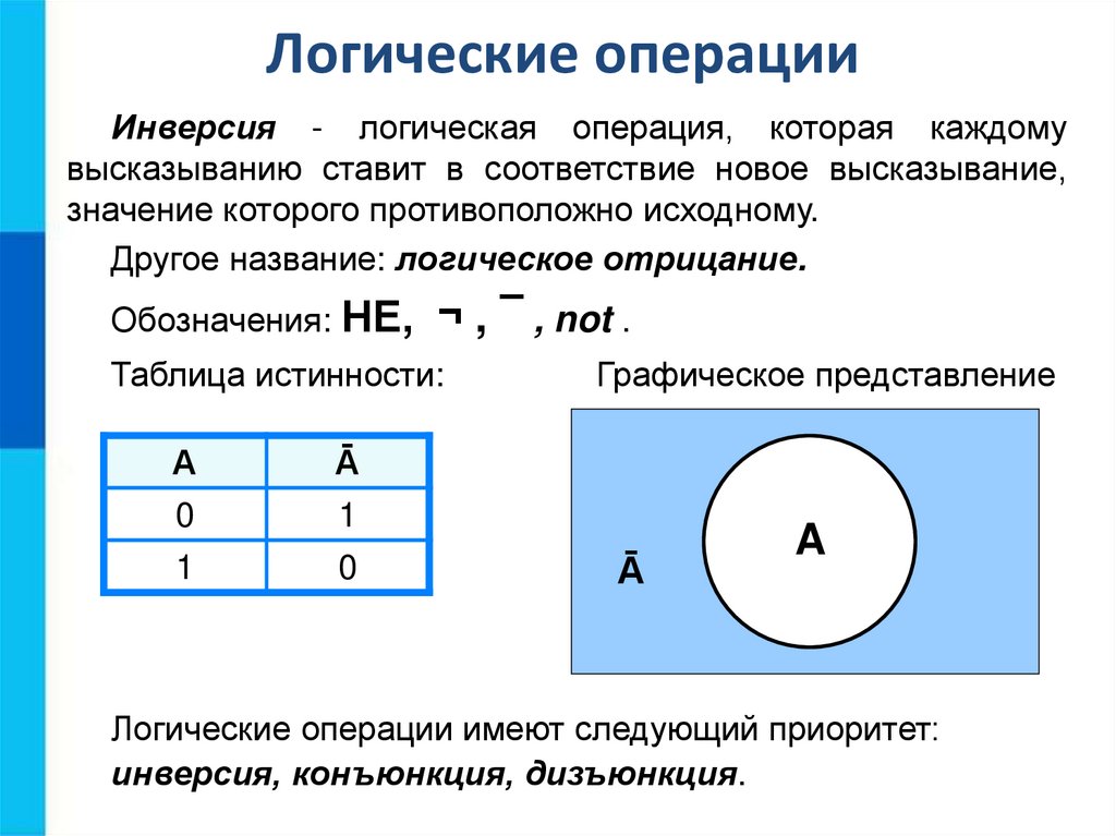 Логические операцииИнверсия - логическая операция, которая каждому